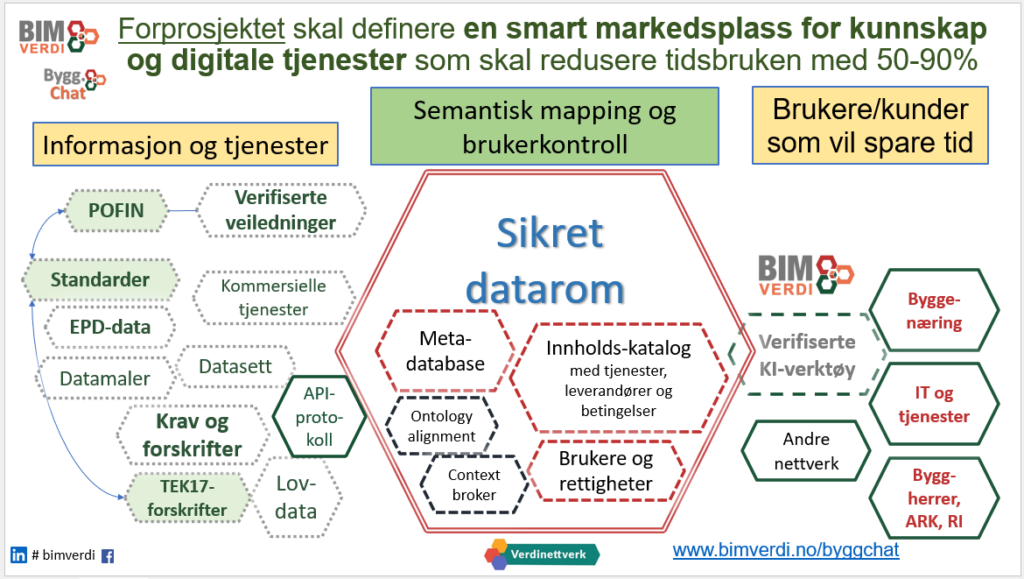 - BIM Verdi har fått tilslag fra Akershus fylkeskommune på forprosjektet ‘ByggChat FP’. Forprosjektetet skal etablere det tekniske, juridiske og sikkerhetsmessige kunnskapsgrunnlaget for ByggChat-tjenesten. I neste fase skal ByggChat realiseres gjennom et eller flere hovedprosjekt. ByggChat skal bli en tjeneste skal bl.a. avklare hvilke ‘føringer’ (forskrifter, krav, standarder) som gjelder for et byggeprosjekt, samt effektivt støtte prosjektgjennomføring, dokumentasjon og rapportering.