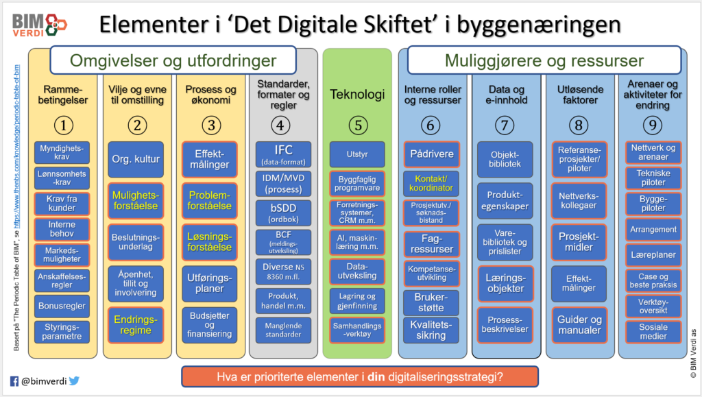 Vår arbeid med praktiske piloter og prosjekter i BIM Verdi har behov for et ‘veikart’, struktur og bekreper som kan skape mening og forenkle kommunikasjonen og effektivisere våre prosesser. Derfor forsterker vi bruke av BIM’en som gjennomgående ‘informasjonshub’ for utfordringer, oppgaver, piloter og tjenester gjennom hele livsløpet. Nøkkelen her er standardisert og maskinlesbare data som gir sømløs dataflyt og kan tolkes av bl.a nye AI-verktøy.