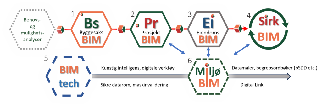 BIM Verdis temagrupper jobber med spesialiserte fagområder og faser som vil kaller formålsBIM. Dette er 1) ByggesaksBIM , 1) ProsjektBIM (prosjektering og bygging), 3) EiendomsBIM og 4) SirkBIM for bl.a. ombruk. I tillegg har vi ‘støttegruppene’ BIMtech for bl.a. KI, validatorteknologi – og MiljøBIM for bl.a. klimagassberegninger fra BIM-data. På nettsiden kan du lese om hver gruppe, se kommende arrangementer og følge arbeidet deres.